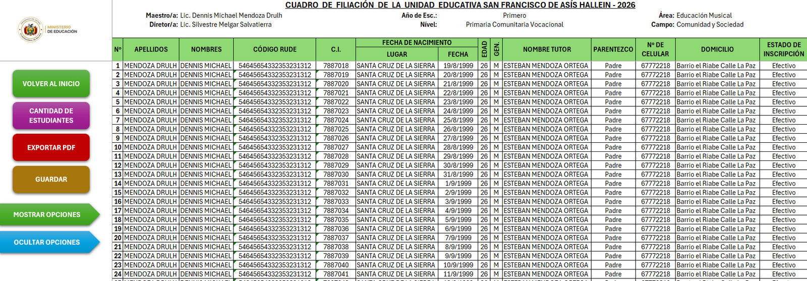 Capacidad para hasta 50 estudiantes con sistema de ocultado automático de filas sobrantes.